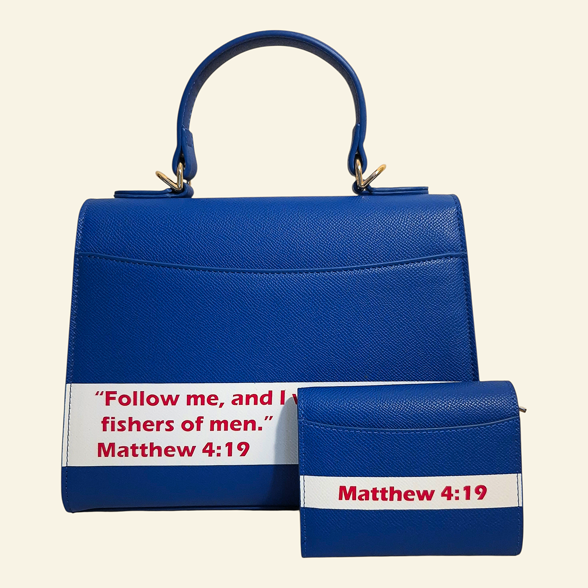 The Galilee duo set is a matching set in deep ocean blue, designed to remind you of the One who calls you. Both pieces feature a crisp white bar with Matthew 4:19 in bold red. The luxury christian handbag has a gold zipper pocket, a main pocket, two pen holders, and a discreet back pocket framed by the verse, it’s perfect for carrying both your essentials and your testimony. The bag also includes a gold button and a sparkling rhinestone fish symbolizing the souls we save through the gospel.